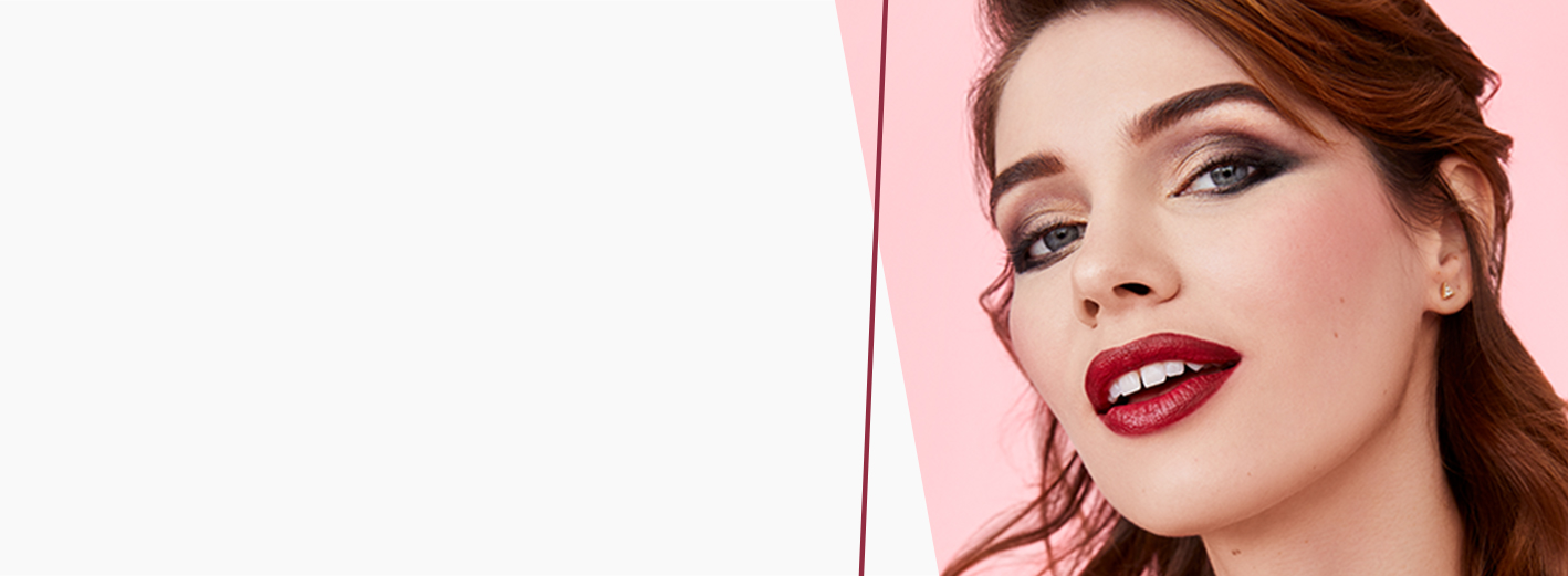 Na rtech vytvořte ombre efekt pomocí Konturovací tužky na rty v odstínu Berry a Polomatné gelové rtěnky v odstínu Berry Famous, kterou nanesete na vnější část rtů. Pouze střední část rtů pak vyplňte Polomatnou gelovou rtěnkou v odstínu Red Stiletto.